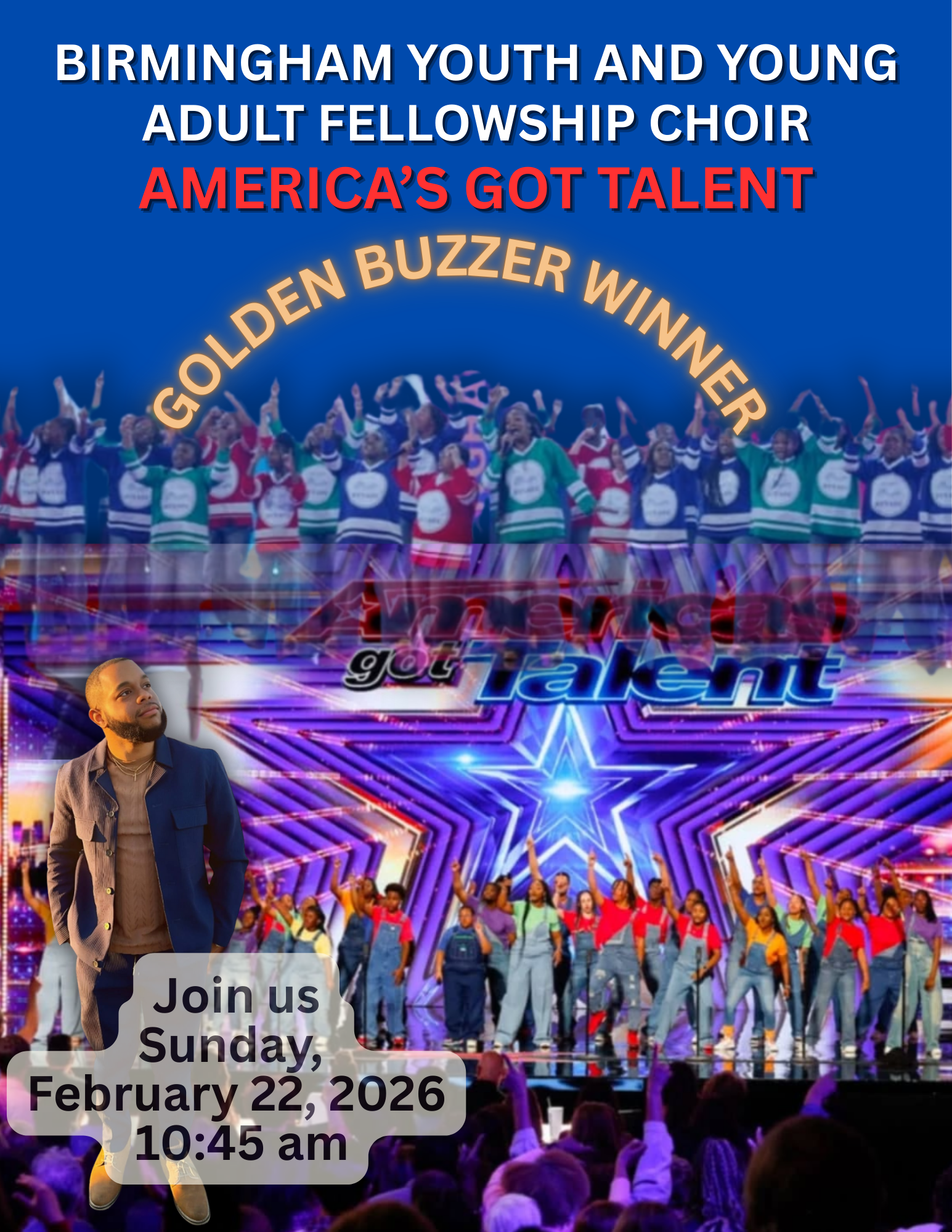 Birmingham Youth & Young Adult Fellowship Choir: America’s Got Talent + Add to Google Calendar + iCal / Outlook export 00 days 00 hours 00 minutes 00 seconds Date Feb 22 2026 Time 10:45 am - 1:00 pm Category Community Event Worship Service Share this event